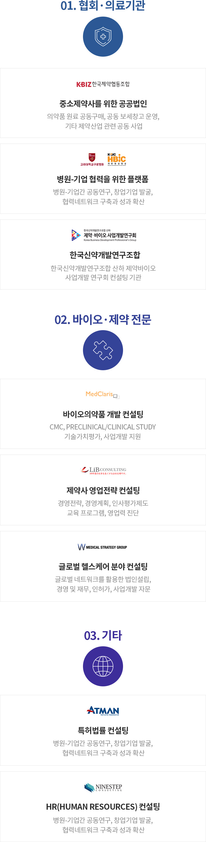 현앤파트너스코리아는 고객사의 높은 생산성과 효율적인 컨설팅을 위해 헬스케어 업종과 관련된 다양한 분야의 전문 기관과 협력하고 있습니다.