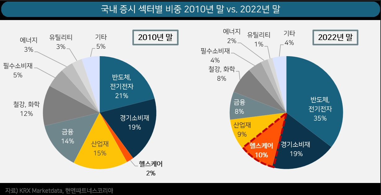 지난 2010년 말 기준, 국내 증시를 구성하는 업종 중 헬스케어의 비중은 2% 남짓이었다. 이때는 2008년 금융위기 극복과 함께 베이징올림픽을 시작으로 중국경제 팽창 효과를 누린 한국이 수혜를 받던 시기다. 그 결과 삼성전자, SK하이닉스는 물론 현대기아차, LG전자, 식음료, 유통 등을 포함한 반도체&전기전자, 경기소비재가 대호황을 누리면서, 전체 증시의 40% 이상을 차지했다. 하지만 지난 2022년 말 기준 헬스케어 비중은 10%를 넘어섰다. 기존 반도체 및 경기소비재의 비중은 더욱 커졌고, 그 사이 산업재, 금융, 철강화학, 필수소비재 업종을 제치고 헬스케어 업종이 국내 3대 대표 업종으로 부상한 것이다.