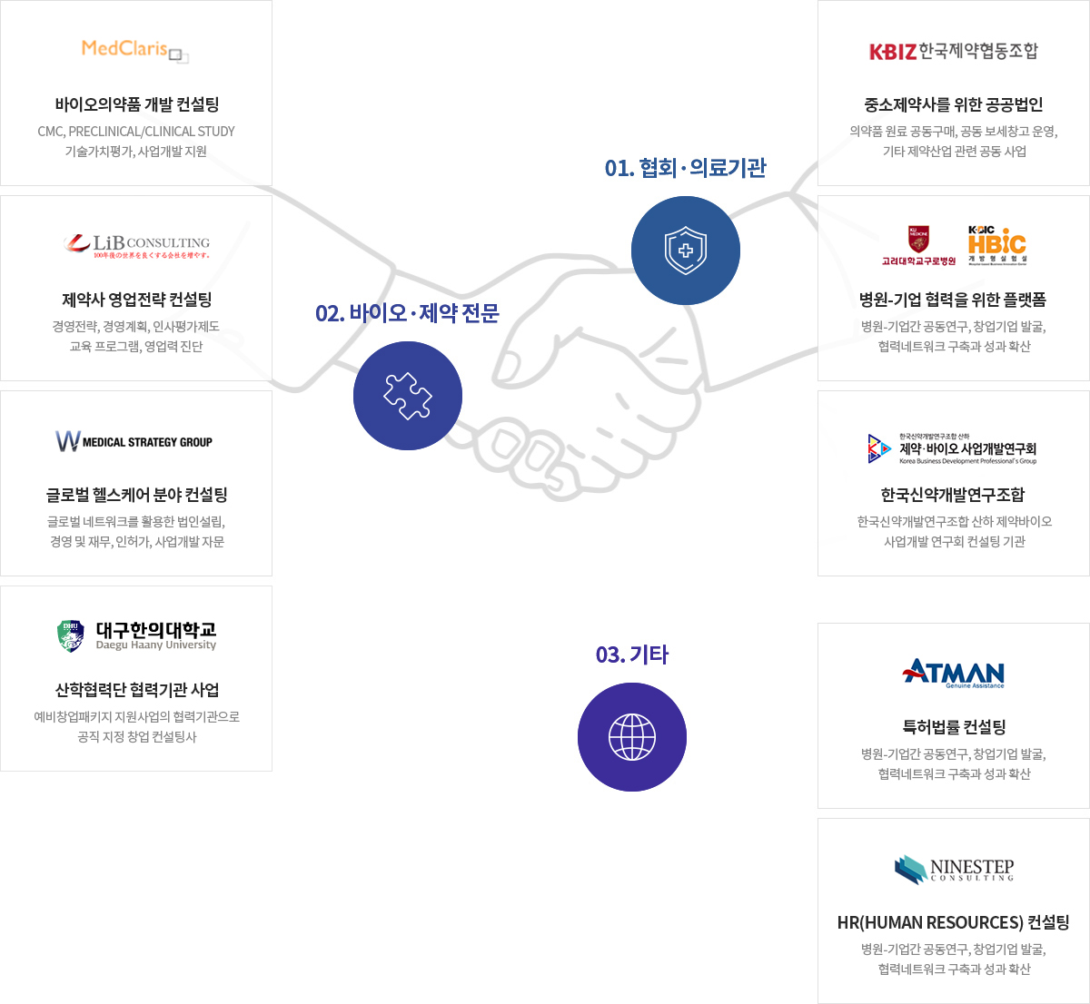 현앤파트너스코리아는 고객사의 높은 생산성과 효율적인 컨설팅을 위해 헬스케어 업종과 관련된 다양한 분야의 전문 기관과 협력하고 있습니다.