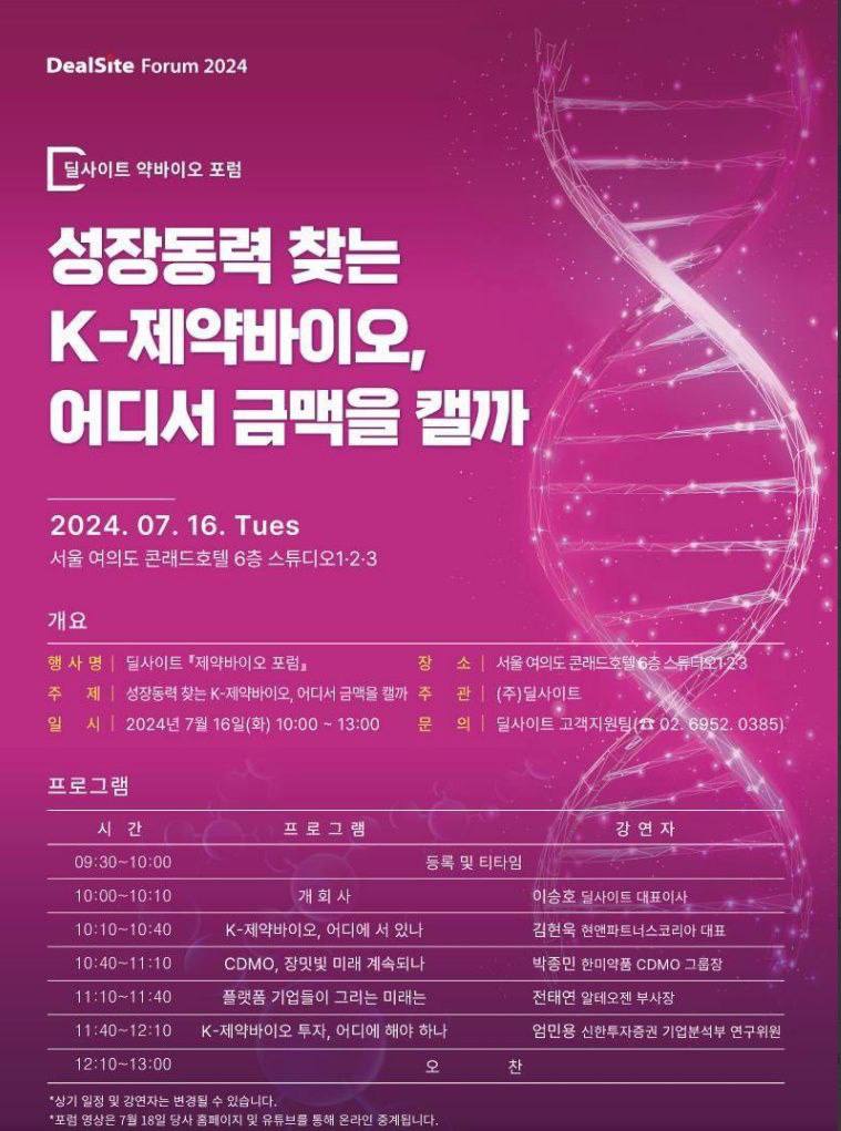 금일 2024 딜사이트 제약바이오 포럼이 개최됩니다.
